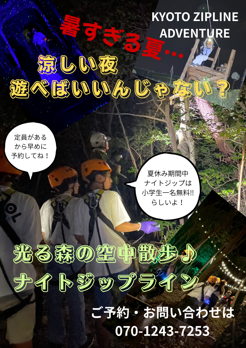 イベント · 2025/07/15 ジップライン アドベンチャーからのお知らせ 暑すぎる夏・・・ 涼しい夜にジップラインで遊びましょう!! ※予約が必要です。 夏のイベント企画!! 事前にお申込みが必要です。 お問合せ・お申し込み先:070-1243-7253 tagPlaceholderカテゴリ: