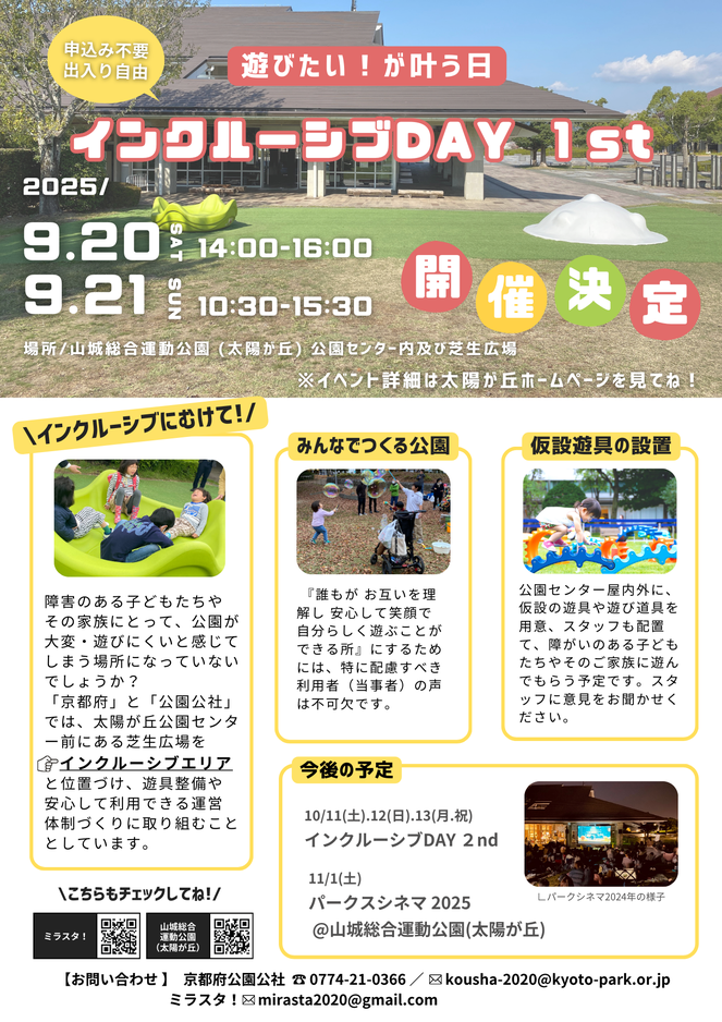 京都府と公園公社では、山城総合運動公園(太陽が丘)の芝生広場および公園センターをすべての人が安心して「遊びたい!」と思える場 =『インクルーシブエリア』と位置づけ、遊具の整備・誰もが安心して利用できる運営体制づくりに取り組んでいます。